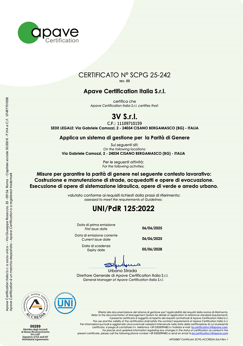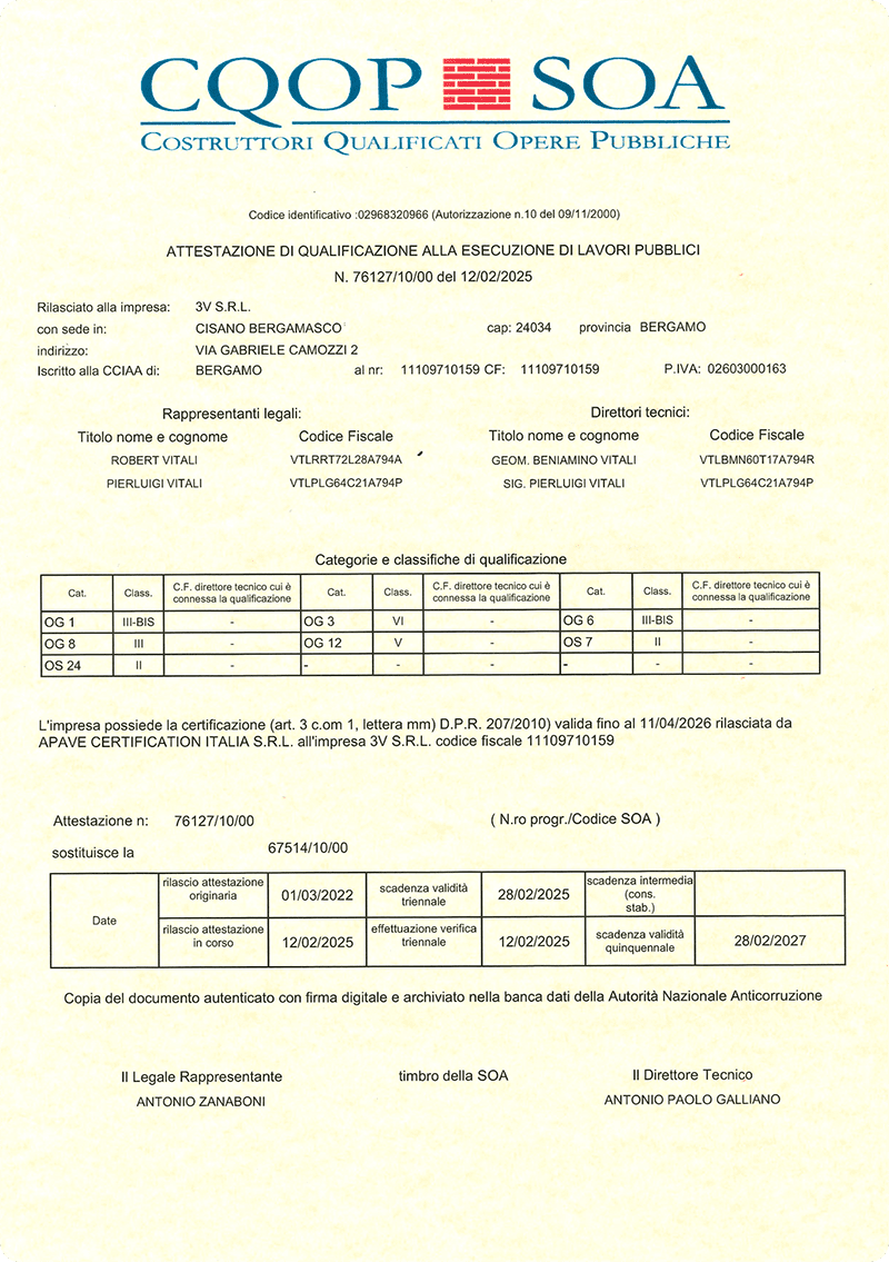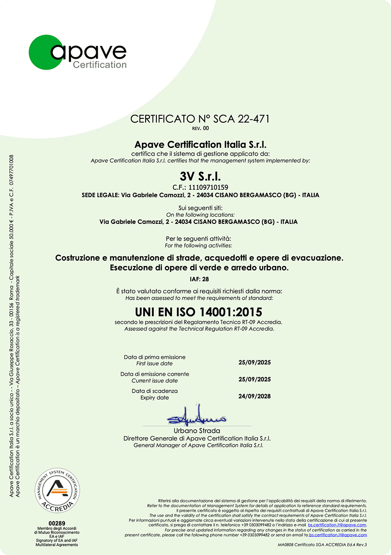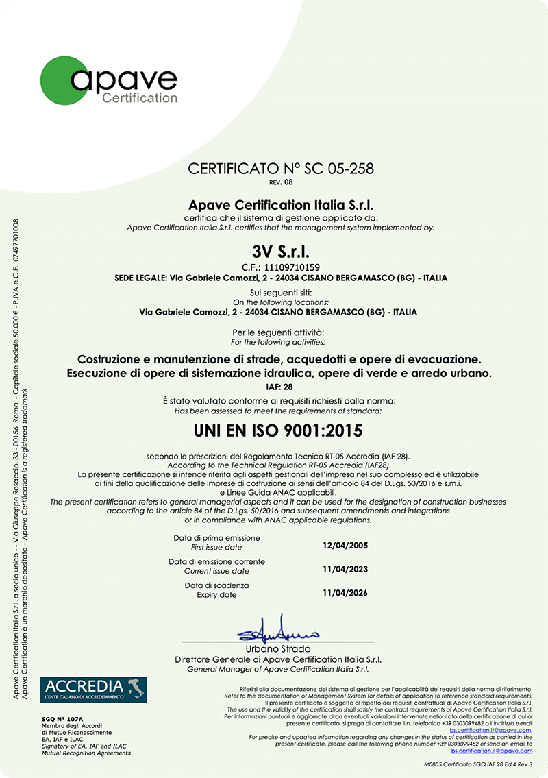 3V SRL è operativa nel settore dell’edilizia pubblica ed in particolare nel sub-settore delle opere stradali, scavi, ristrutturazioni in genere, fognature, opere di urbanizzazione, idrodemolizioni, opere idrauliche, di realizzazione aree verdi, di riqualificazioni ambientali, opere civili in genere, opere di bonifica e protezione ambientale.